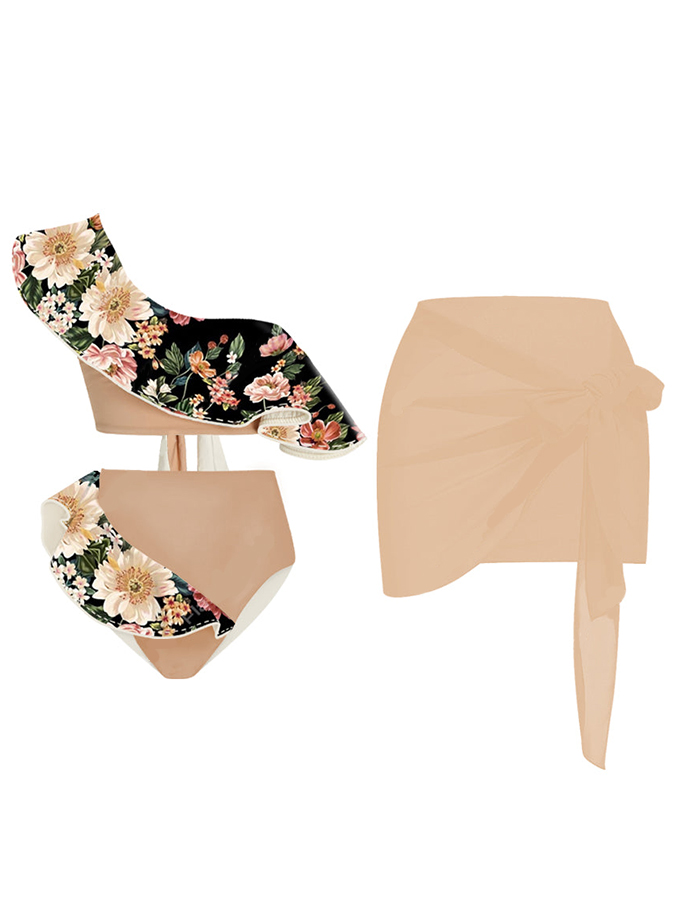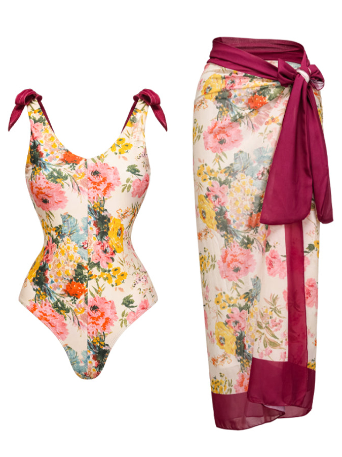 Floral Cutout Backless One Piece Swimsuit and Skirt
