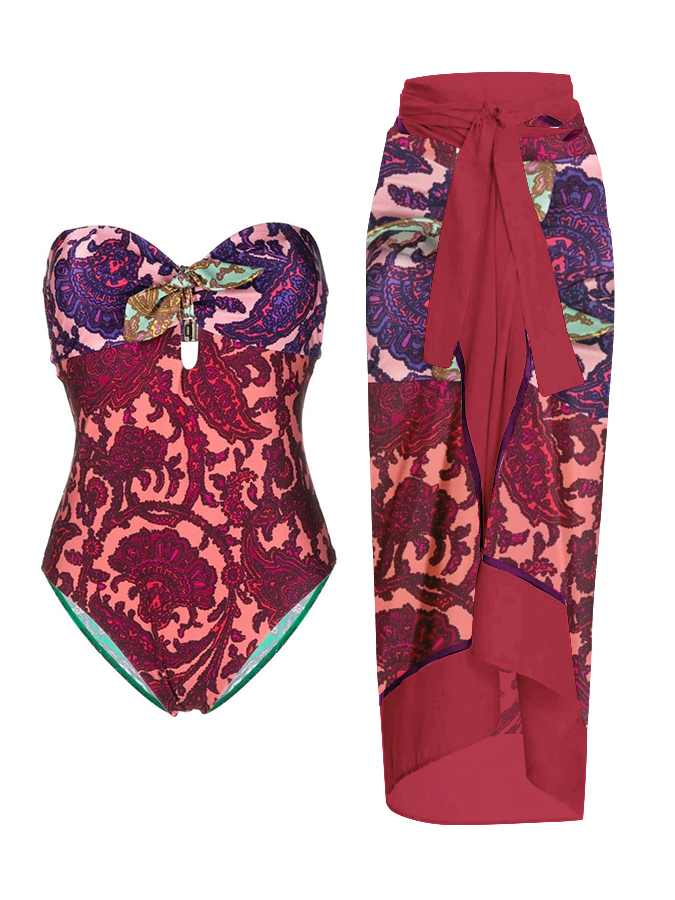 Bandeau Printed One Piece Swimsuit With Belt and Cover Up