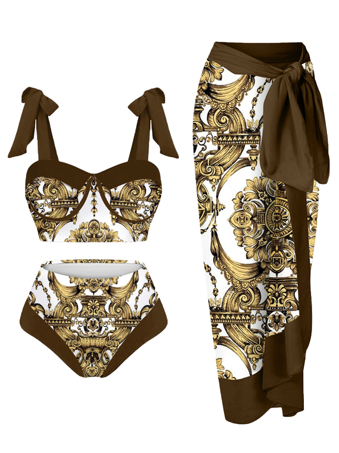 Vintage Colorblock Floral Print Bikini and Cover Up