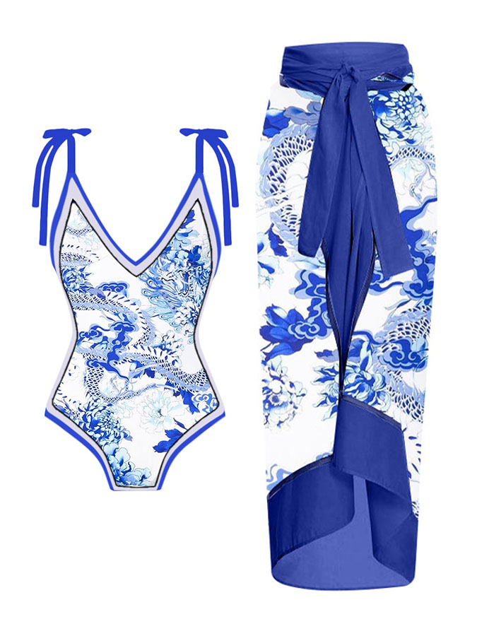 V-Neck Floral Print One-Piece Swimsuit and Cover-up