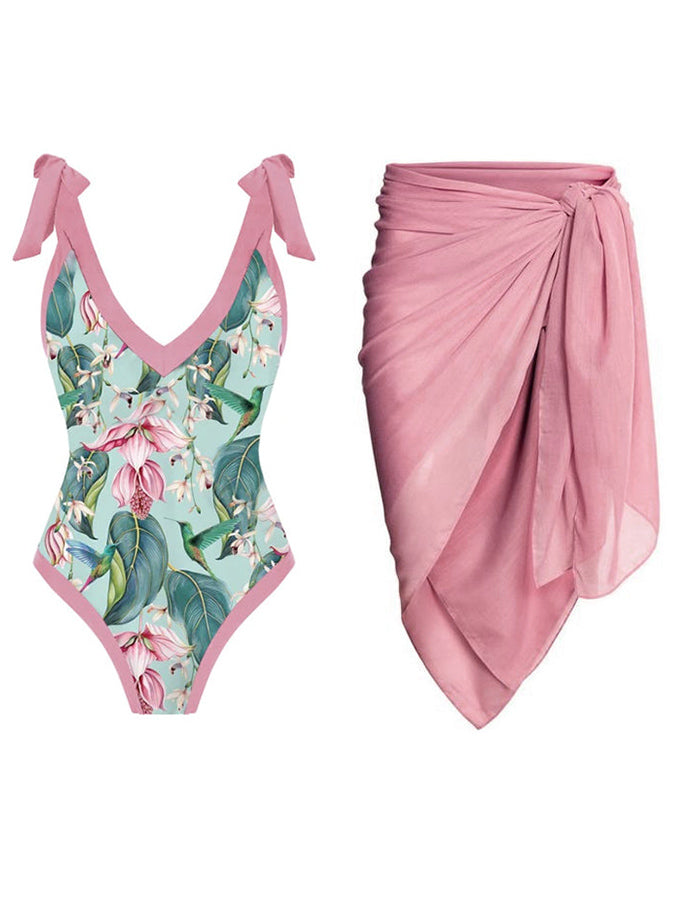 V-Neck Print One-Piece Swimsuit Set